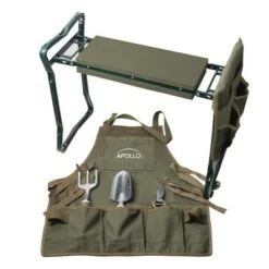 Contains: Foldable Kneeler and Seat, Tool Pouch with 4 pockets, Cotton Gardening Apron, 12″ Trowel, 12 ” Rake, 8″ Pruners