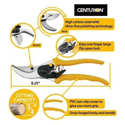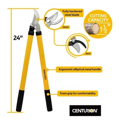 Clean up branches in your yard with ease with this 3 Piece Lopper, Hedge Shear, and Pruner Tree Branch Cutting Tool Set from CENTURION.Each tool in this tree cutting set features high carbon steel cutting blades that stay sharper longer than traditional steel, so you can get done with yard work quicker. The comfortable PVC foam non-slip grip handles absorb shock, putting less strain on you. With a 1.5-inch cutting capacity, the 24-inch long lopper is best used to cut down tree branches. The 8-inch hedge shear features a shock-absorbing bumper that reduces strain, making it ideal for cutting large, straight areas on bushes or trees. With a 1 finger flip open lock, the 8.24-inch pruner can quickly be ready to cut branches and twigs up to 0.75 inches in diameter to keep your outdoor space looking its best.Break down fallen branches in your yard or keep your trees looking their best with this 3 Piece Lopper, Hedge Shear, and Pruner Tree Branch Cutting Tool Set from CENTURION.