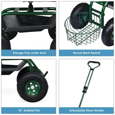 Are you looking for a useful garden rolling cart to help you take care of your plants? Our garden cart with solid steel frame is both practical and modern, which is suitable for any kinds of garden. This rolling cart comes with a large seat, which is ergonomic and comfortable. The height of seat can be adjusted and the seat can rotate at 360 degrees to meet your different needs. Featuring with a utility basket and a tool tray under the seat, it is convenient for you to do the gardening efficiently and effectively. 4 large inflated rubber tires have deep patterns can grip the ground safely to prevent tipping over. Featuring with a steeling rod with handle, the cart can swivel in any direction. . Specification: Material: Steel, Rubber, Plastic. Color: Green. Overall Dimension: 38” x 17” x (19”-21”) (L x W x H) . Dimension of Basket: 11.5” x 5” (L x W ) . Diameter of Wheel: 10”. Net Weight: 34 lbs. Ma x Weight Capacity: 330 lbs. Package Include: . 1× Garden Cart. 1× Instruction.