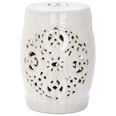 Exquisitely crafted, the Panarea ceramic garden stool features a pierced leaf medallion motif of Asian inspiration. Replete with lucky coin top detail and ceramic nailheads, Flora is a timeless beauty.
