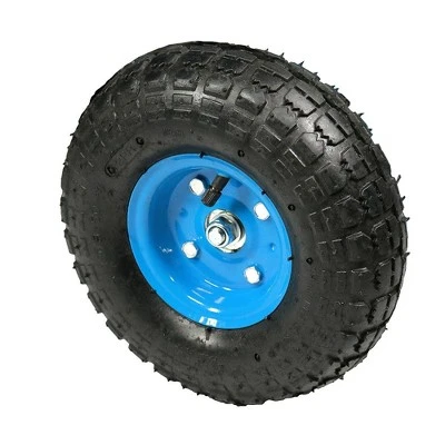 - Has solid steel axles and 10″ diameter x 3″ W pneumatic tires
