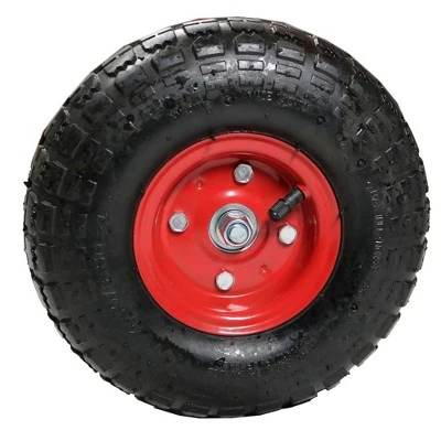 - Has solid steel axles and 10″ diameter x 3″ W pneumatic tires