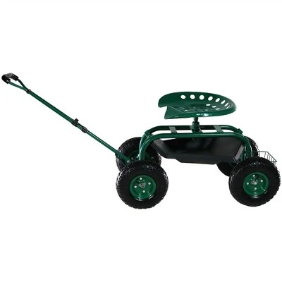 Sunnydaze Decor Sunnydaze Outdoor Lawn and Garden Heavy-Duty Steel Rolling Gardening Cart with Extendable Steer Handle, Swivel Chair, and Basket – Green